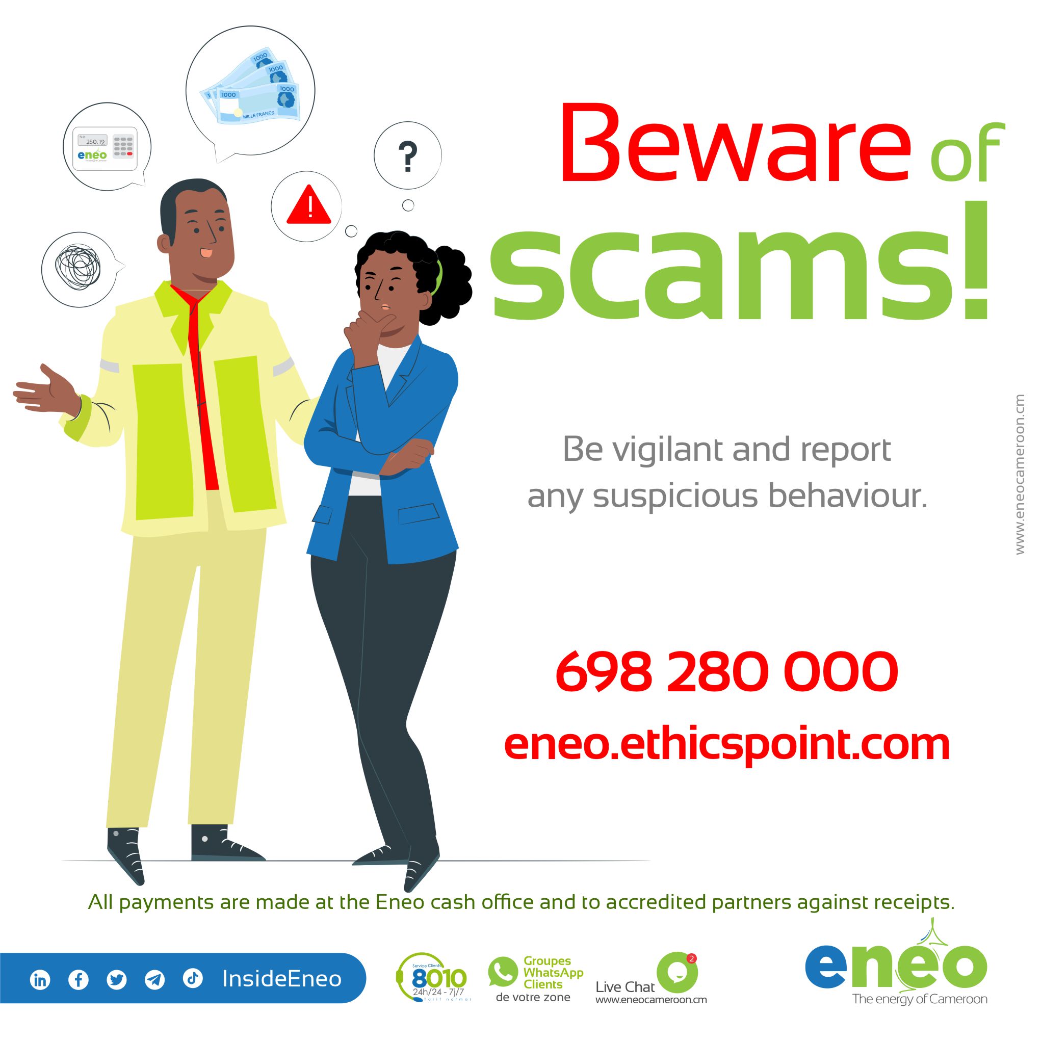 - Report any suspected scam immediately to our customer service team, available 24/7 on 8010 or LiveChat at https://my.eneocameroon.cm/ or 698 280 000.