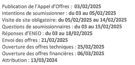 La société Eneo vous invites à déposer vos offres les meilleurs pour l’Appel d’offres en objets suivant planning ci-dessous :