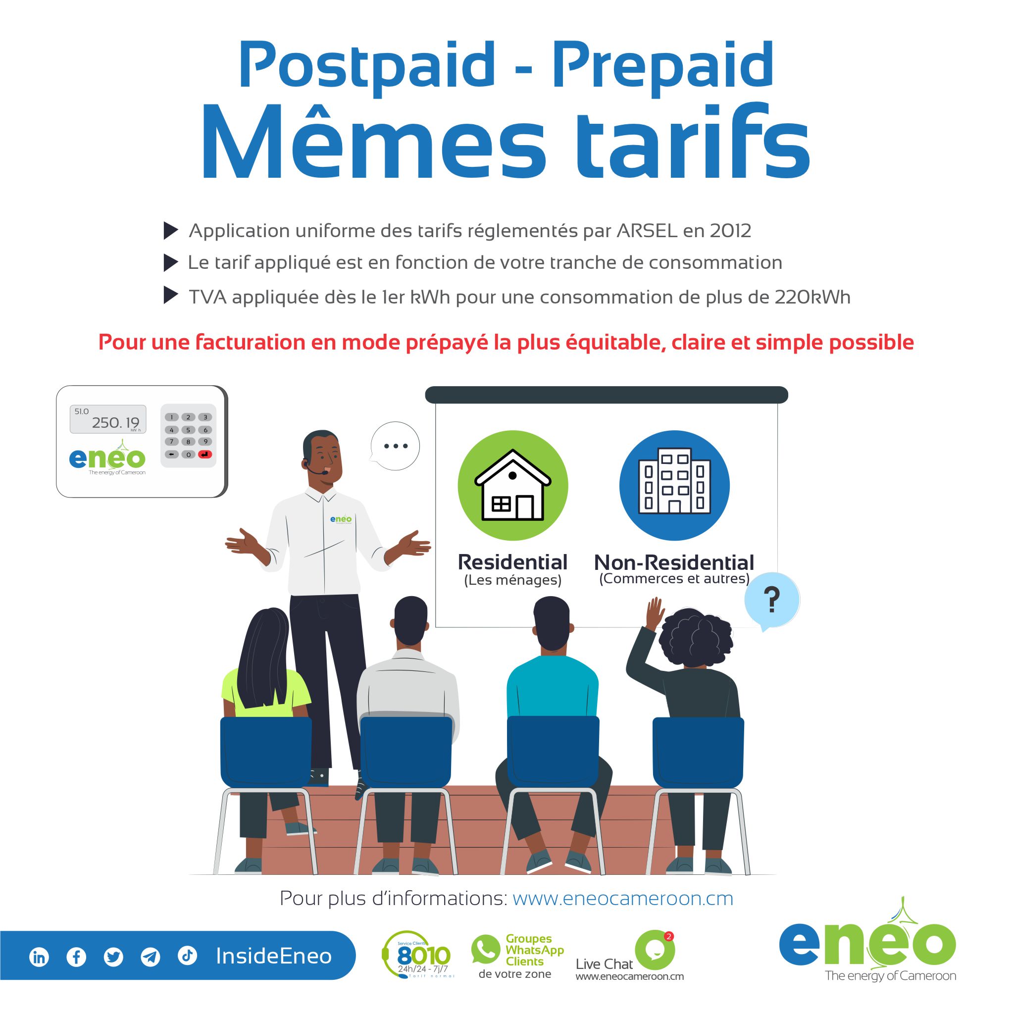 À la demande du régulateur, Eneo appliquera dès le 1ernovembre 2024, les tarifs règlementés par l’Agence de Régulation du Secteur de l’Electricité (ARSEL) aux deux modes de consommation existants : en prépayé lorsque le client achète et programme un crédit d’électricité avant de consommer, et en postpayé lorsque le client reçoit une facture à la fin du mois.Après une période transitoire qui a facilité l’accès à la solution prépayée à plus de 800.000 ménages et entreprises, conformément aux conclusions de la réunion ARSEL-Associations des Consommateurs-Eneo de mars 2023 à Mbankomo et de celle du 23 octobre 2024 à Yaoundé, Eneo est tenue d’appliquer aux clients prépayés la seule décision tarifaire en vigueur depuis 2012.