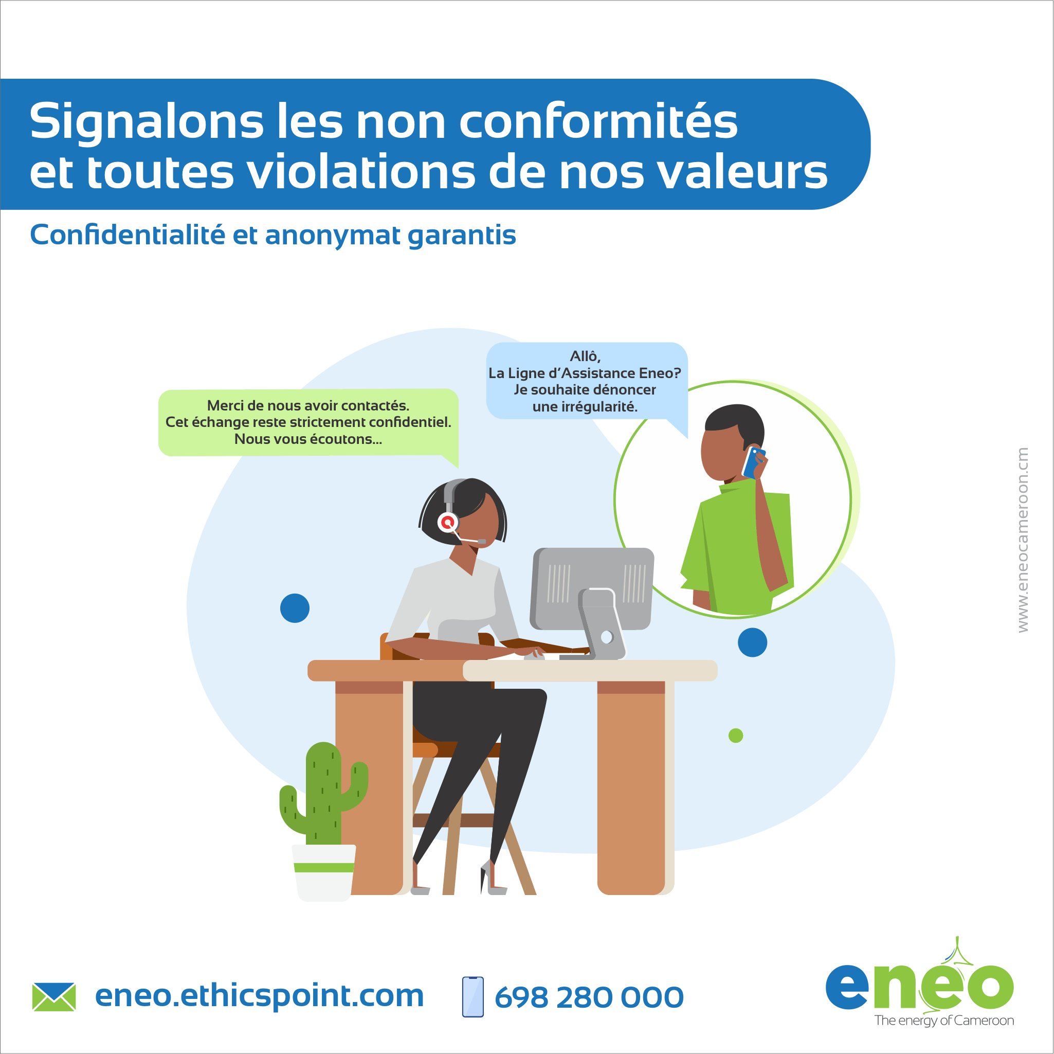 Nous attirons votre attention sur le fait que des individus malveillants, sans rapport avec Eneo, profitent très souvent de ce contexte pour abuser les clients les moins avertis. Pour vous prémunir d’une éventuelle arnaque ou de tout autre désagrément, ayez les bons réflexes :