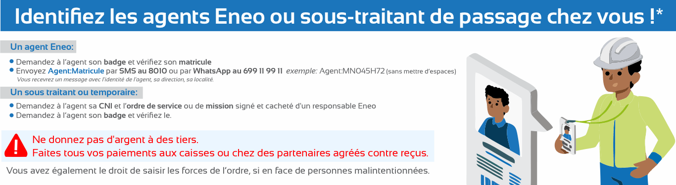- Ne donnez en aucun cas de l’argent à des tiers ! Toutes les transactions financières se font aux caisses Eneo ou chez des partenaires agréés contre reçus.