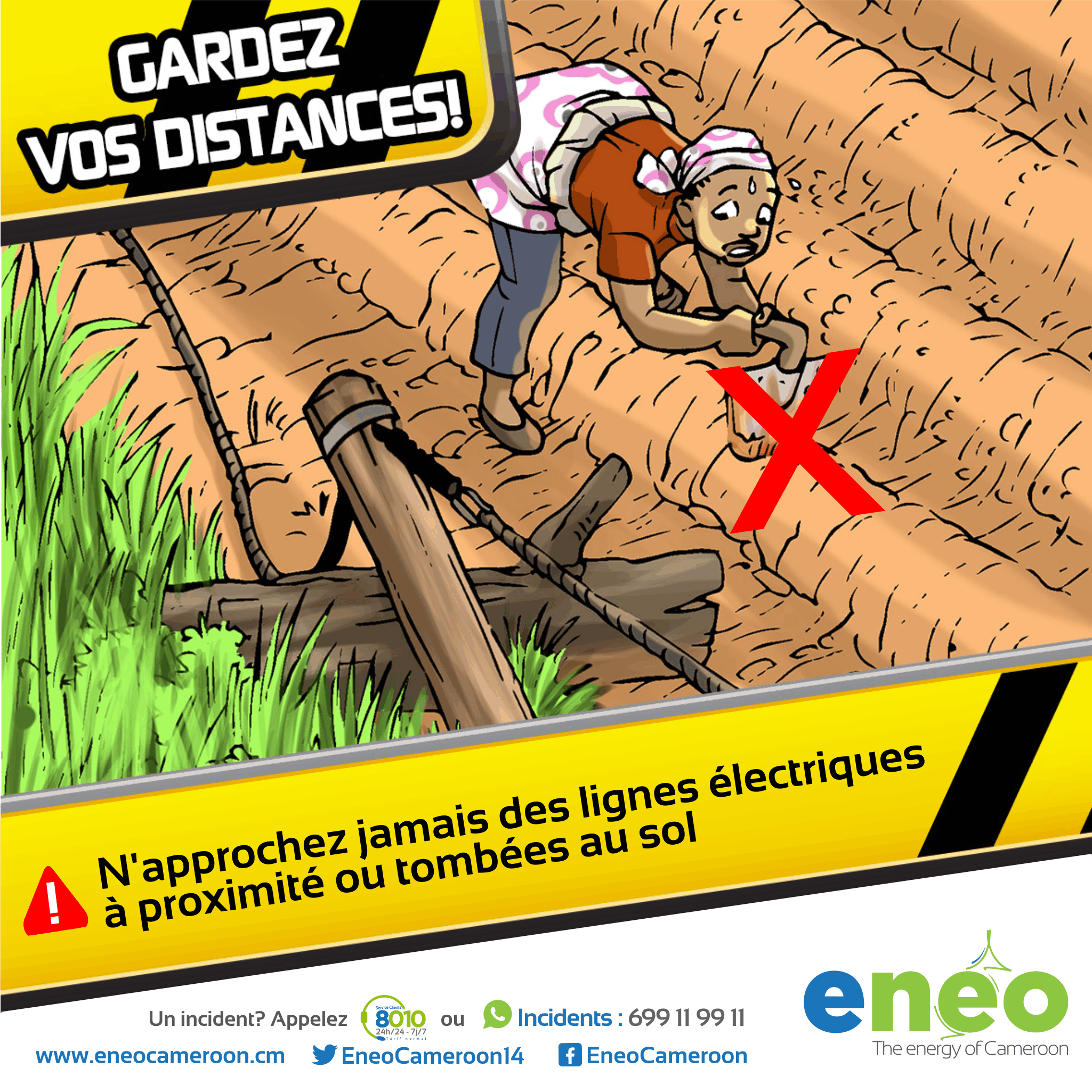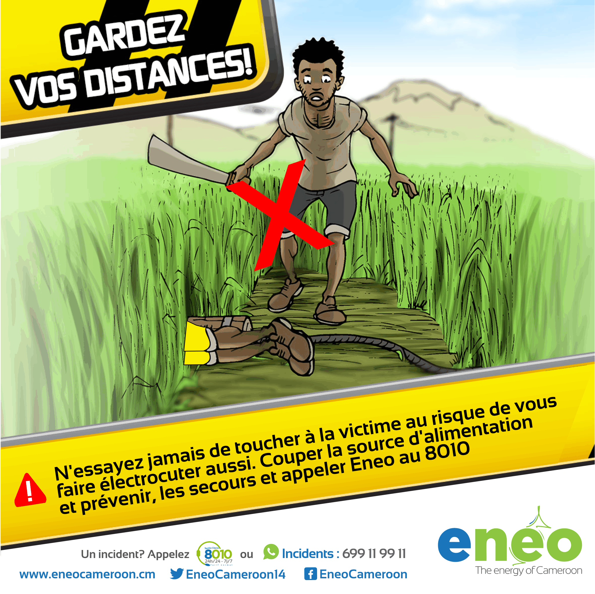 2. N’essayez jamais de toucher à la victime au risque de vous faire électrocuter aussi. Couper la source d'alimentation et prévenir les secours. Appeler Eneo au 8010.4